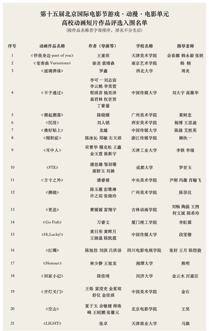 近日,第十五届北京国际电影节组委会揭晓“游戏·动漫·电影单元”入围名单,雷竞技RAYBET2024届员工张卓毕业设计作品《LIGHT》成功入围高校动画短片单元。